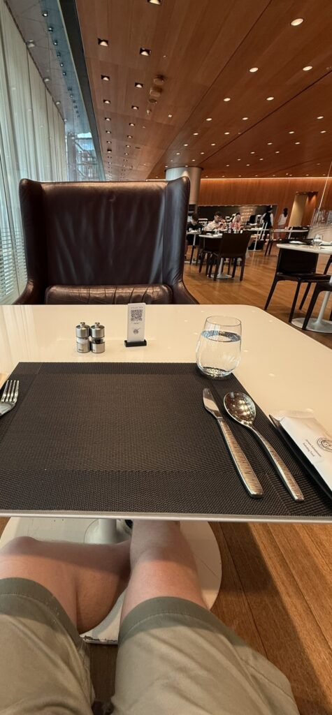 Next morning, I headed back to the airport and to the dedicated business and first-class check-in drop-off point, that I was now very well acquainted with. As soon as I walked through the door my bag was taken off me and I headed to a business class check in desk, where they don’t have seats like first-class does. That seemed to be the only difference between the two sides. I was soon checked in and heading straight through to the dedicated security and immigration at the end of the business class check-in aisle. Unlike first-class, business class does not lead you directly to a lounge but spits you out in duty-free so that you can go shopping before you head to the main concourse. As my flight was now significantly later than my previous scheduled flight, I had a lot of time to kill that day. I had spent the morning working in my hotel and pushing the check-out limits to its maximum possible time before heading back to the airport. But I still had over 3 hours to kill. I decided I was going to have lunch at the airport and then dinner later on the flight home made sense, as I would be landing evening time in the UK. This time I headed it straight up to the transit and went straight to C-gates, where the Orchard is, and went up to the south Lounge that overlooks the Orchard. This is a wonderful lounge space to go and sit in for some time to kill. I found some snacks, a drink and they even offered me table service in here. Given the situation in the Middle East, particularly the attack on Qatar, and the fact that there are no European airlines flying to the airport, the airport itself was extremely quiet. I think I were about 10 people in this particular lounge at the time. I suspect the lounge could easily have handled several hundred people without a problem. So, they were very happy to get me table service and bring me anything I wanted. I found a nice spot overlooking the garden where I could relax for a bit.