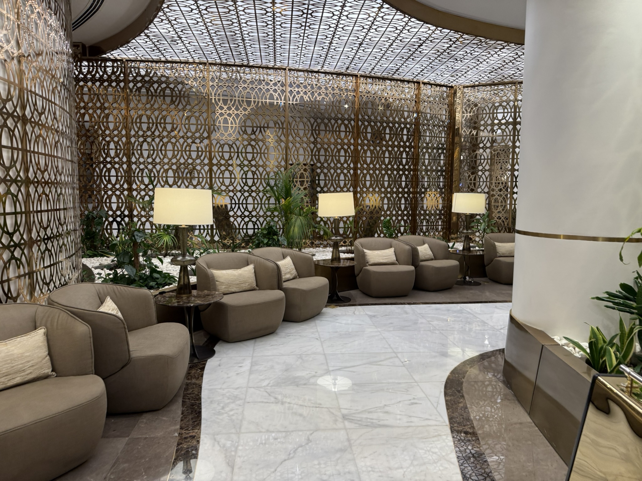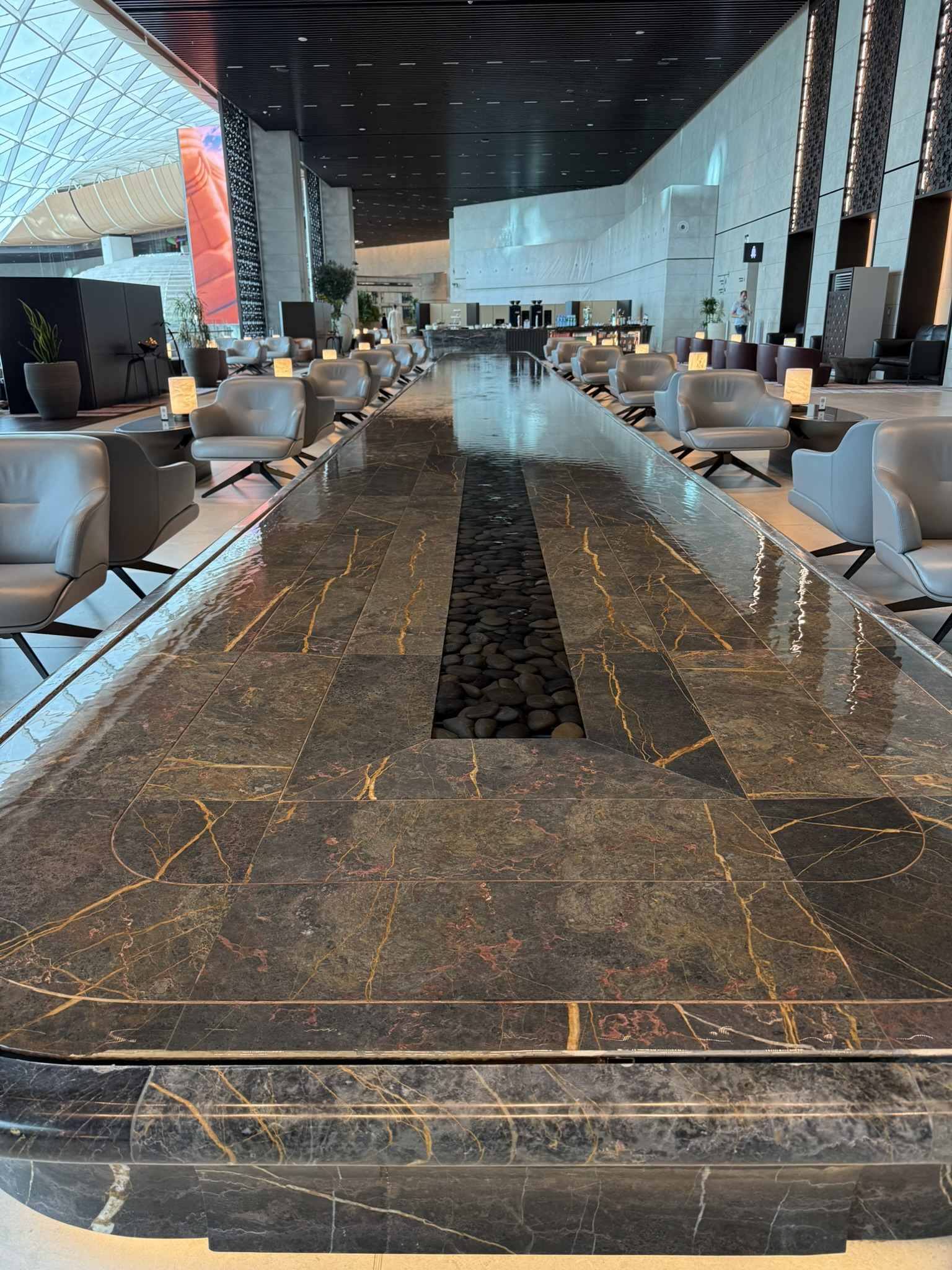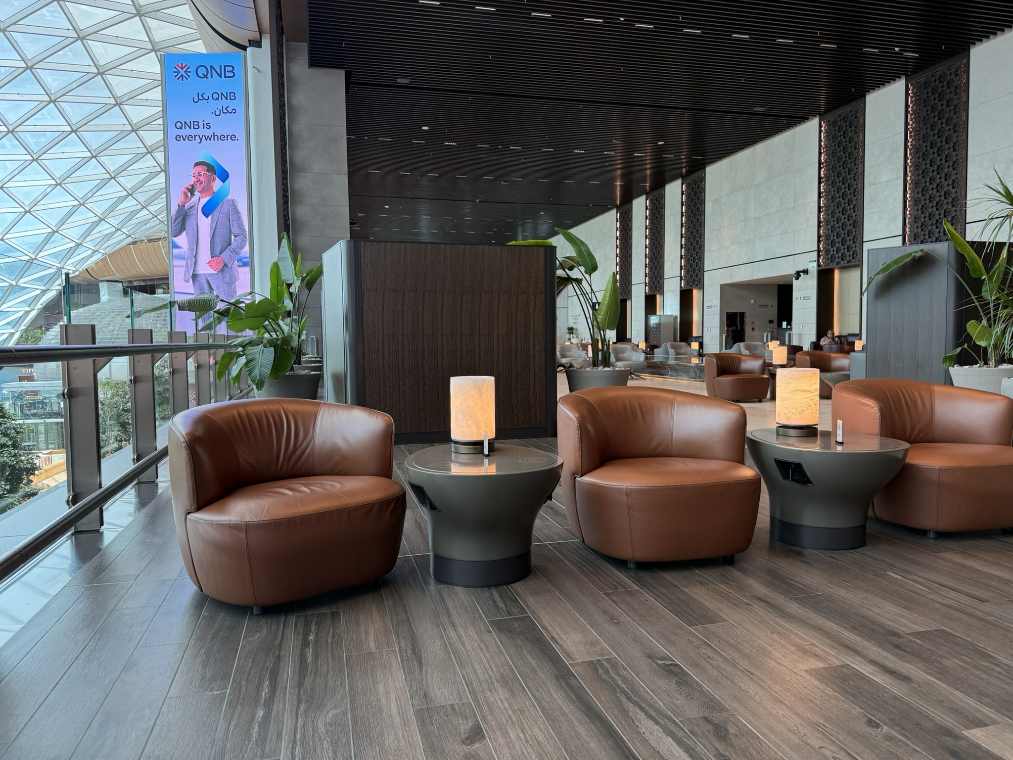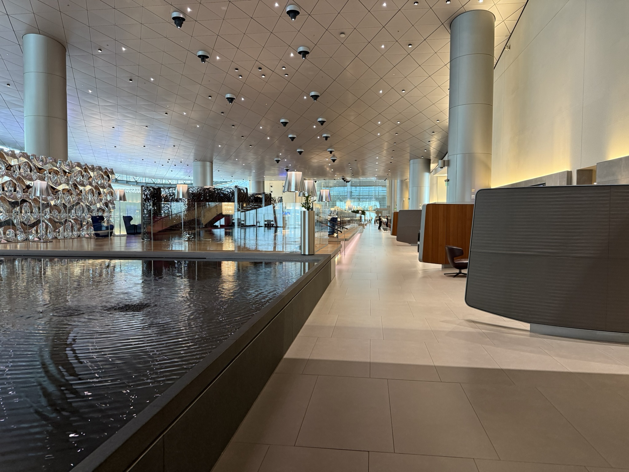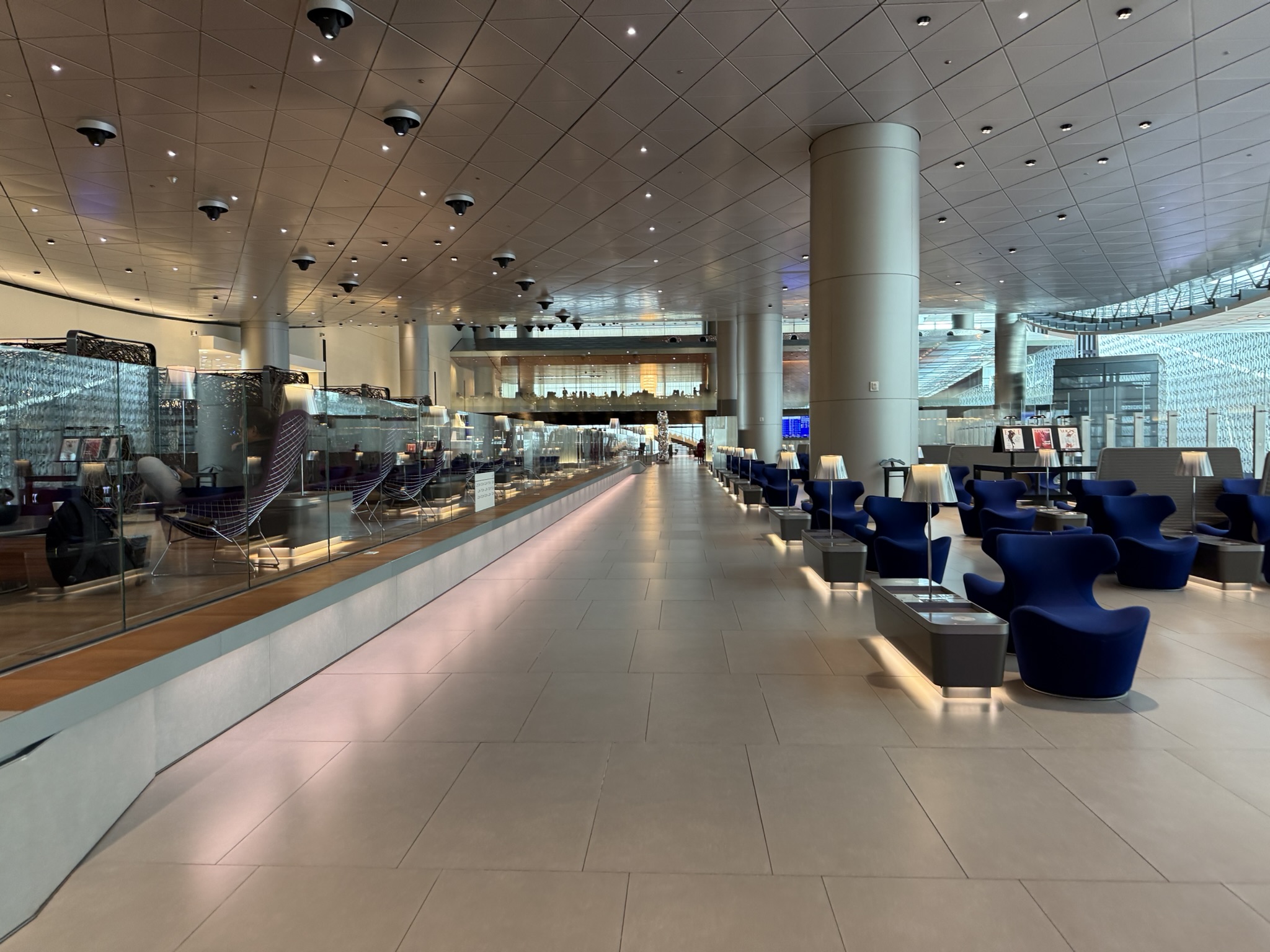 Next morning, I headed back to the airport and to the dedicated business and first-class check-in drop-off point, that I was now very well acquainted with. As soon as I walked through the door my bag was taken off me and I headed to a business class check in desk, where they don’t have seats like first-class does. That seemed to be the only difference between the two sides. I was soon checked in and heading straight through to the dedicated security and immigration at the end of the business class check-in aisle. Unlike first-class, business class does not lead you directly to a lounge but spits you out in duty-free so that you can go shopping before you head to the main concourse. As my flight was now significantly later than my previous scheduled flight, I had a lot of time to kill that day. I had spent the morning working in my hotel and pushing the check-out limits to its maximum possible time before heading back to the airport. But I still had over 3 hours to kill. I decided I was going to have lunch at the airport and then dinner later on the flight home made sense, as I would be landing evening time in the UK. This time I headed it straight up to the transit and went straight to C-gates, where the Orchard is, and went up to the south Lounge that overlooks the Orchard. This is a wonderful lounge space to go and sit in for some time to kill. I found some snacks, a drink and they even offered me table service in here. Given the situation in the Middle East, particularly the attack on Qatar, and the fact that there are no European airlines flying to the airport, the airport itself was extremely quiet. I think I were about 10 people in this particular lounge at the time. I suspect the lounge could easily have handled several hundred people without a problem. So, they were very happy to get me table service and bring me anything I wanted. I found a nice spot overlooking the garden where I could relax for a bit.