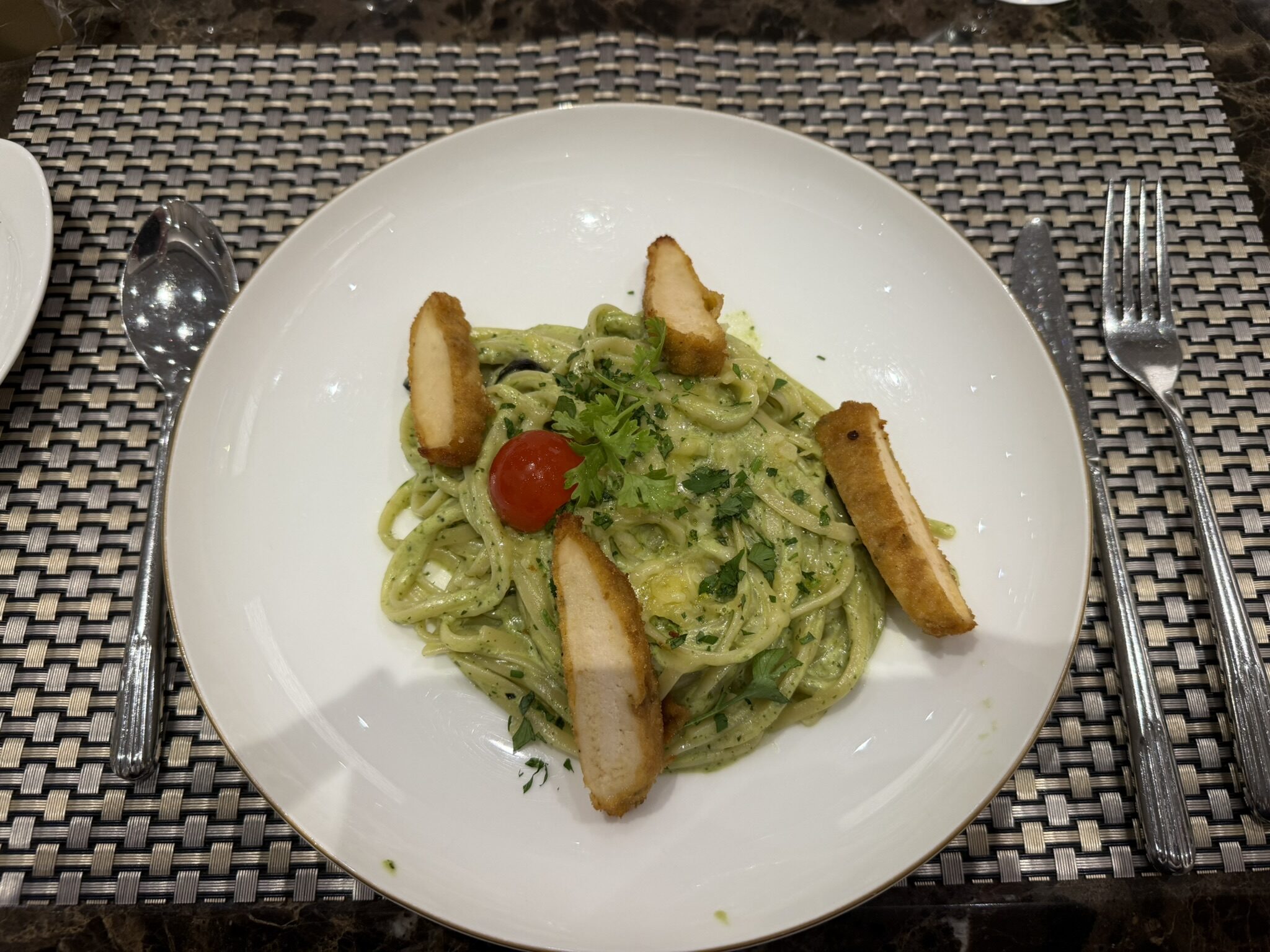 The lounge looked very new and clean, I think it might have been refurbished recently. My first impression was that it wasn’t very big. But this turned out to be a mistake. It was very cleverly designed with lots of secluded areas in separate sections to give the impression of a nice cosy small lounge, whilst actually having plenty of space. The restaurant area was in the middle, with table service, and a bar section round the side. Then there were various different routes with lots of other rooms and areas you could go and sit in if you want to. There’s also a staircase leading to an upstairs area, which was closed, so I guess on a busier day they may open that up to provide plenty of space for everyone. I’d allowed plenty of time for this flight, just in case I was delayed getting to the airport, so I had some time to kill. I went and found a coke and some Hummus to nibble on while I waited for dinner time. Later I headed to the restaurant area, where it was table service, and there was a selection of four different main courses available. By this point I’ve eaten a lot of Arabic food and I decided I needed a change, so I chose the pasta, which was absolutely delicious. When I finished that it was time to go and get my flight, so I headed out to the gate.