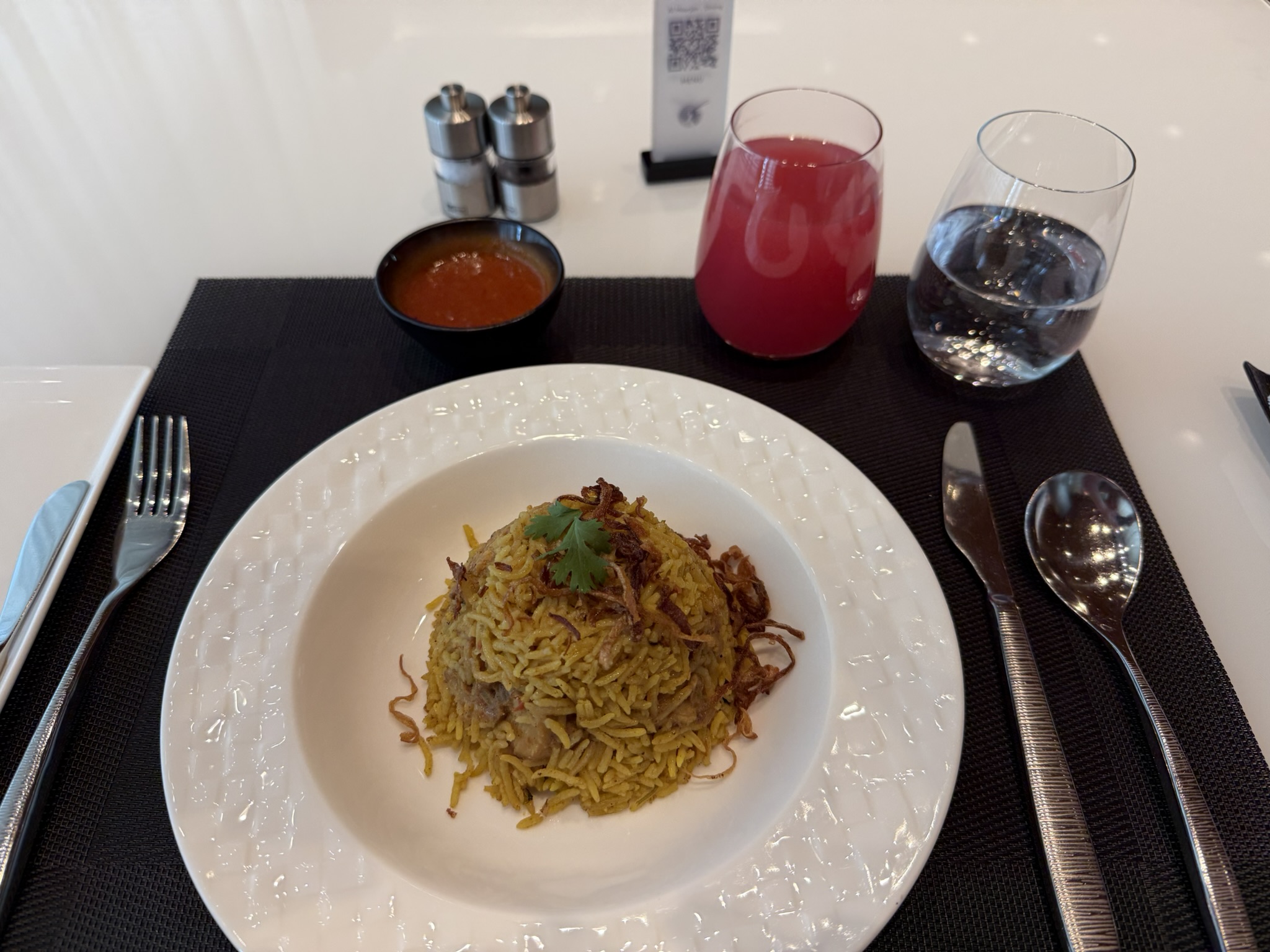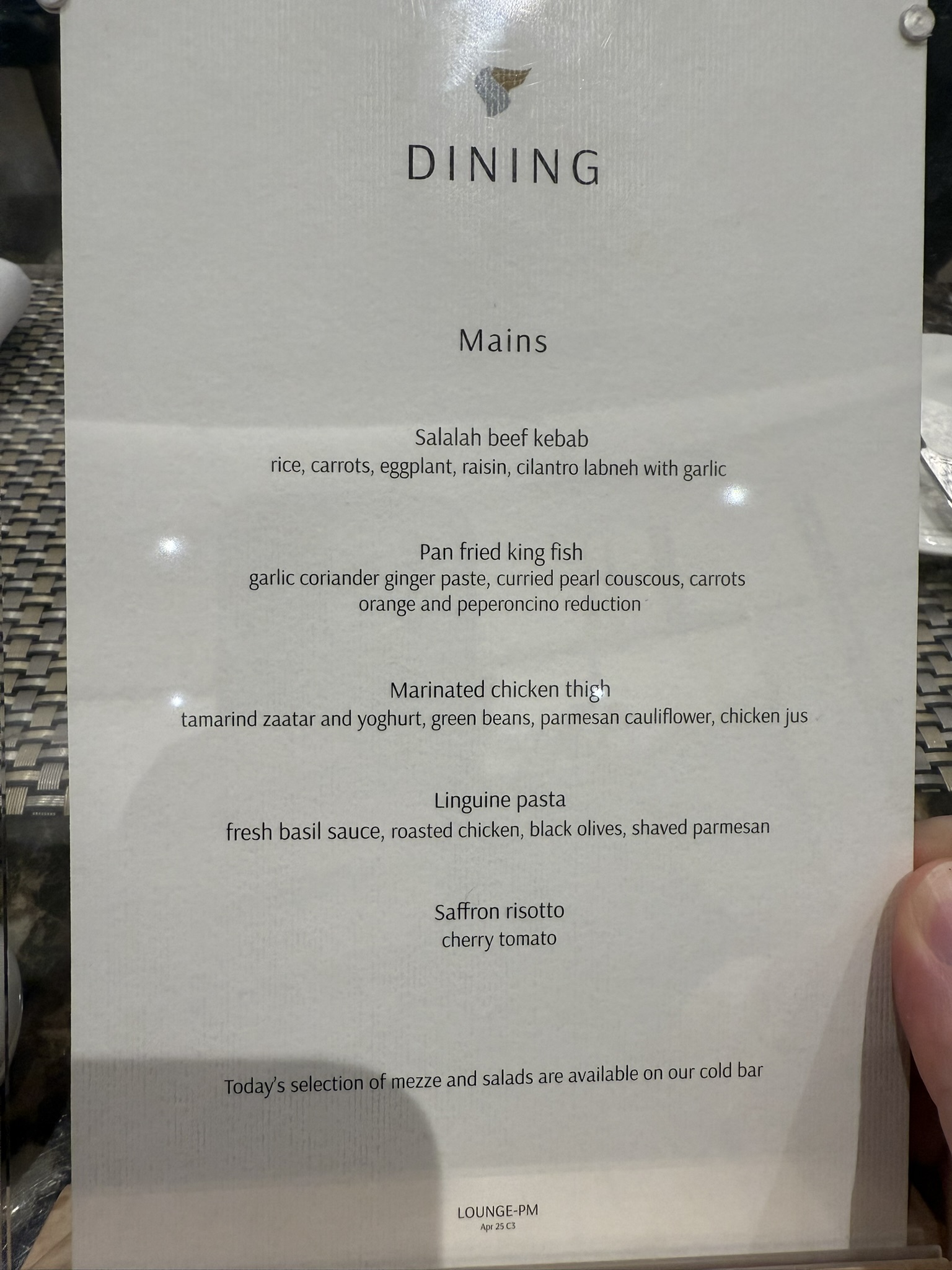 When it came to dinner time I headed back to the other lounge as I’ve never had a sit-down meal at the restaurant before. I went over, past the giant water feature and up the stairs to the restaurant. The restaurant offered both table service and a buffet service. That said, the buffet service is still manned by a Chef who fills your plate with whatever you want. The buffet didn’t particularly appeal, but I quite liked the menu, so I ordered from the menu and had some very nice Arabic chicken. After dessert, I headed it down to the main lounge area, which was also completely deserted, to relax for another 20 minutes before I had to head to my flight.