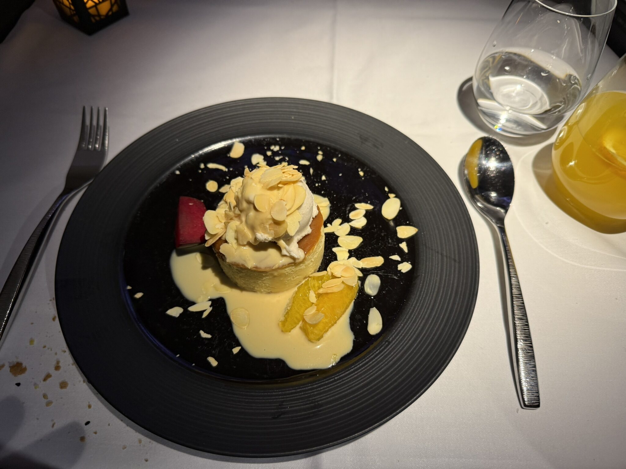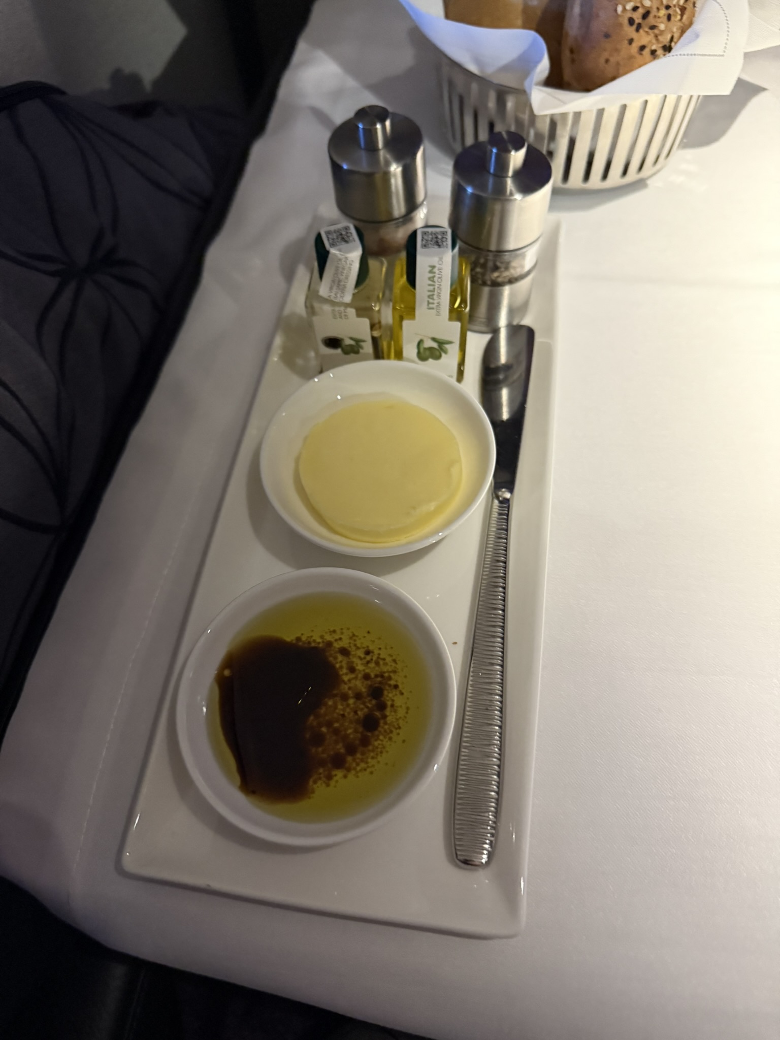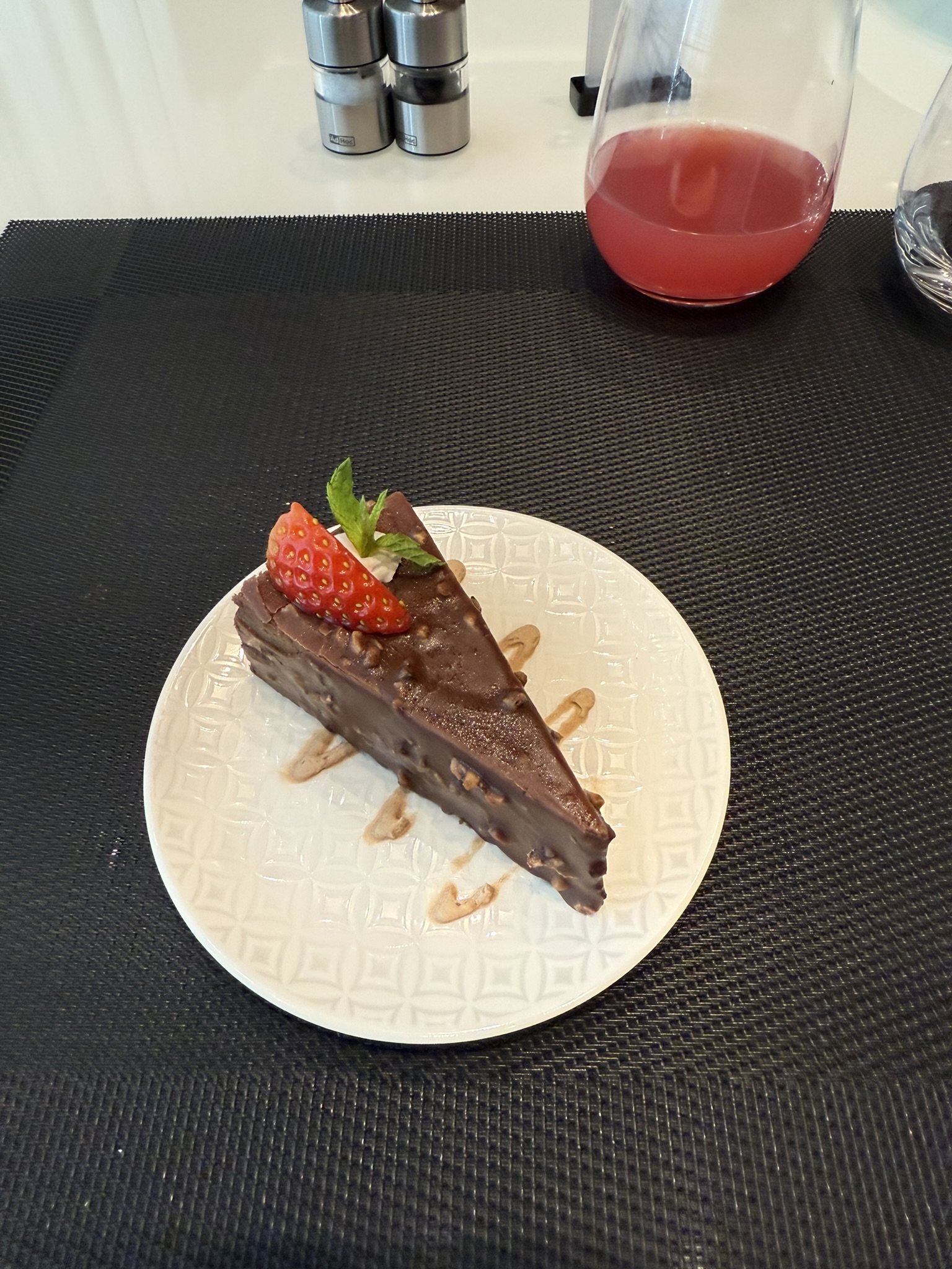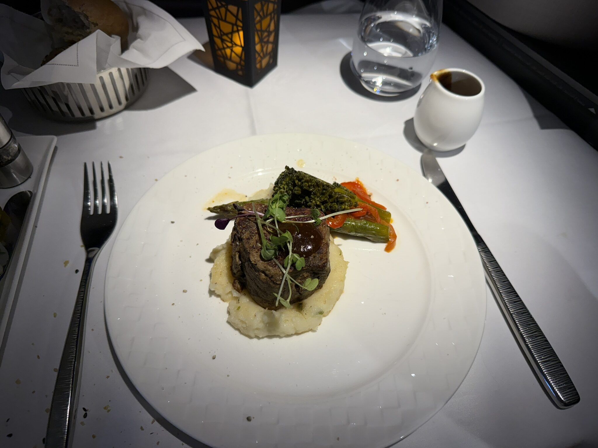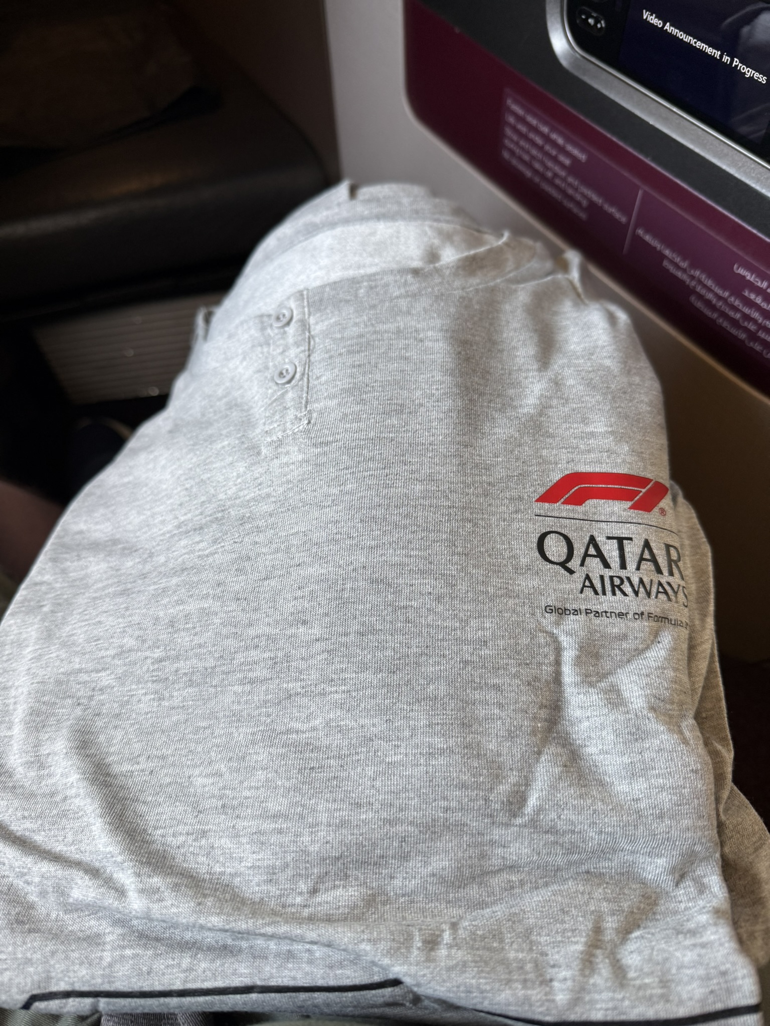With the change of plans, I was now booked on a Qatar flight, in a 777 and in a Q-suite. I managed to move my seat to be at the front, so I was now in 1K, a rear facing window seat. And if you’ve read my other reports, you’ll know that I’m a big fan of the Q-suite and the service on Qatar. I was invited to board nice and early, I had plenty of time to sit down and enjoy the pre-flight service. I took one more lime and mint, just to refresh myself fully before I started on the champagne. And of course it came with a towel, a date and an Arabic coffee. A full menu was issued with a choice of mains and light snack meals. Just before take-off the crew came around and asked me what and when I wanted to eat. I opted for pink champagne and snacks after take-off and my main meal to be served about three hours into the flight. This was about halfway which would’ve been roughly dinner time in the UK, so I would feel about right when I landed. I do very much enjoy the pink champagne they serve on Qatar, and I had several glasses on this flight. They also have a tray of snacks available, which they brought over, and I selected some chocolate and some popcorn to enjoy. When it came to dinner time I’d opted for the steak. They gave me very nice bread and olive oil to enjoy and an amuse-bouche to get started. I turned down the starter, I don’t like caviar, controversial I know! And for dessert, I had a delightful chocolate caramel tart. All washed down with a nice cocktail. They had issued me with their Formula One branded pyjamas on boarding, which I changed into straight after take-off. So, after my late meal I settled down to try and get a bit of a power nap so that I could survive the rest of the night. It was a very bumpy flight, but I actually quite enjoy turbulence when I’m trying to sleep, I don’t know why, but it seems to send me off. We actually landed significantly earlier than scheduled, I think they were planning for tighter air restrictions due to the conflict, which didn’t actually happen, so we were able to take a quicker route. As always Qatar service is amazing, the seat is amazing, and I always enjoy flying with them.