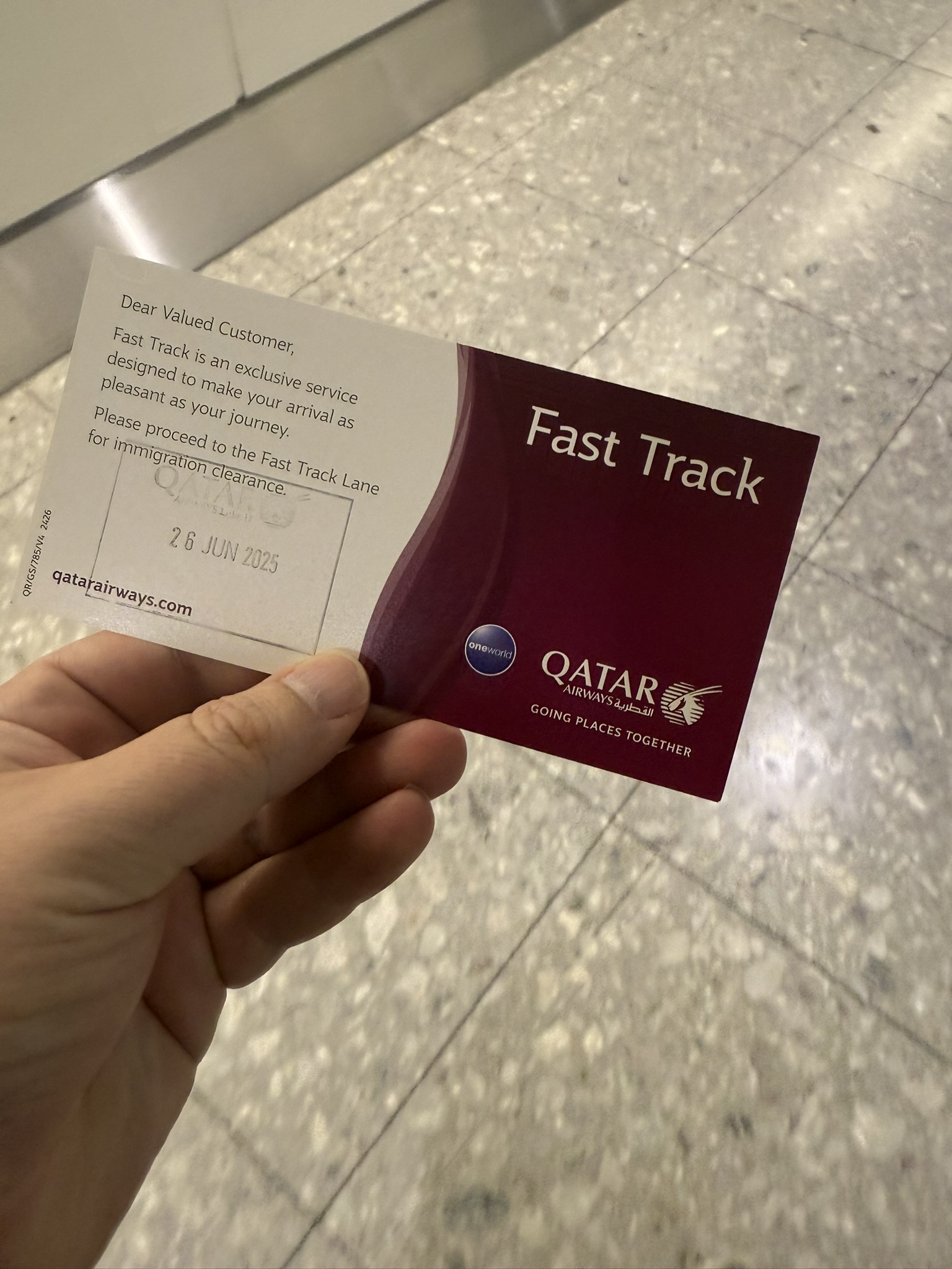 After a delightful flight in the Q-suite with Qatar I finally arrived in London Heathrow terminal 4. As I was departing the aircraft they were issuing fast track vouchers, which were date stamped, to all business class customers, presumably so that we could use the fast-track immigration lines when we got there. The air bridge was connected pretty quickly, and we walked off towards the passport gates. Terminal 4 has a bizarre traffic flow system of people walking around a huge square block, you have to go one way round if you are EU/UK and the other way round for all other passports, meaning you’ve got a corridor with two sets of traffic going against each other. So, after my little trek through the corridors, I arrived at the passport control area and the fast track was all manned with a small queue, but the e-gates were empty, so I ditched my fast-track voucher and headed straight to the e-gates.