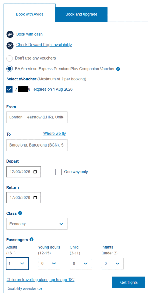 Now on the book with Avios tab. If you are going to use a voucher, this is where you pick it. It will show you the expiry dates. If you use an AMEX voucher for 1 person, like I have, you will get a 50% discount on the number of Avios this trip will cost you.