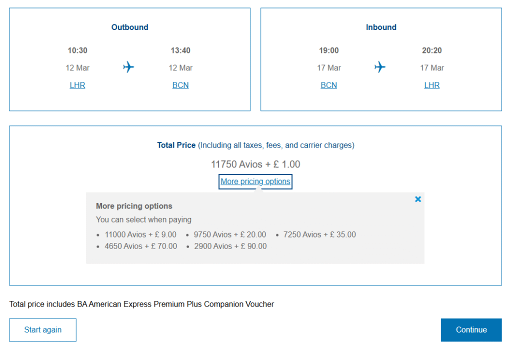 You’ll see there’s an option for more pricing options where you can pay more money and less Avios points. Sometimes, these deals aren’t always that good, but in this case I did the maths on it and most of them are roughly the same amount of money. What I do is convert the avios to cash and the add the amount they are charging to get my true price. Roughly I go by 1p per avios. So the main price we’re being offered here is £118.50. But even the least amount of avios here only works out at £119.